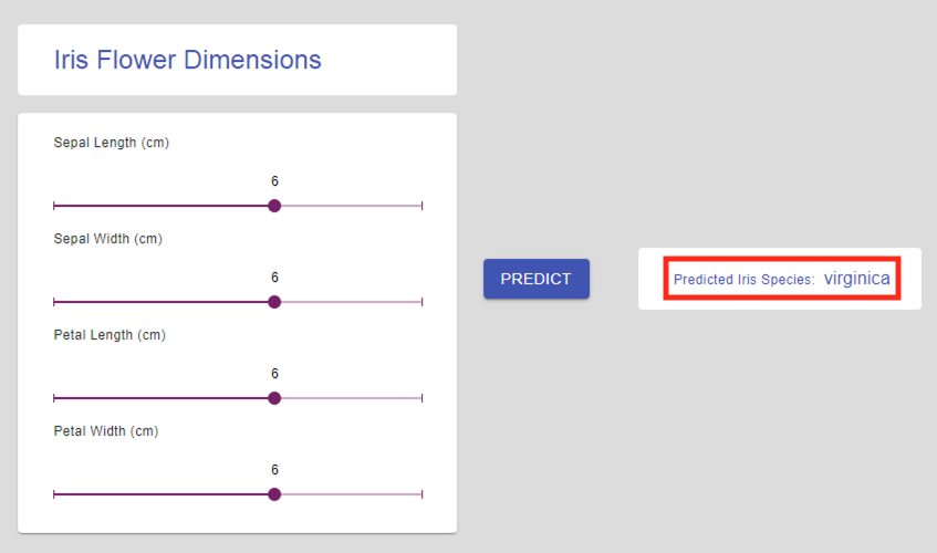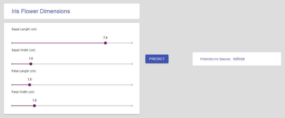 Move the sliders across and click on Predict to get flower names based on their physical attributes