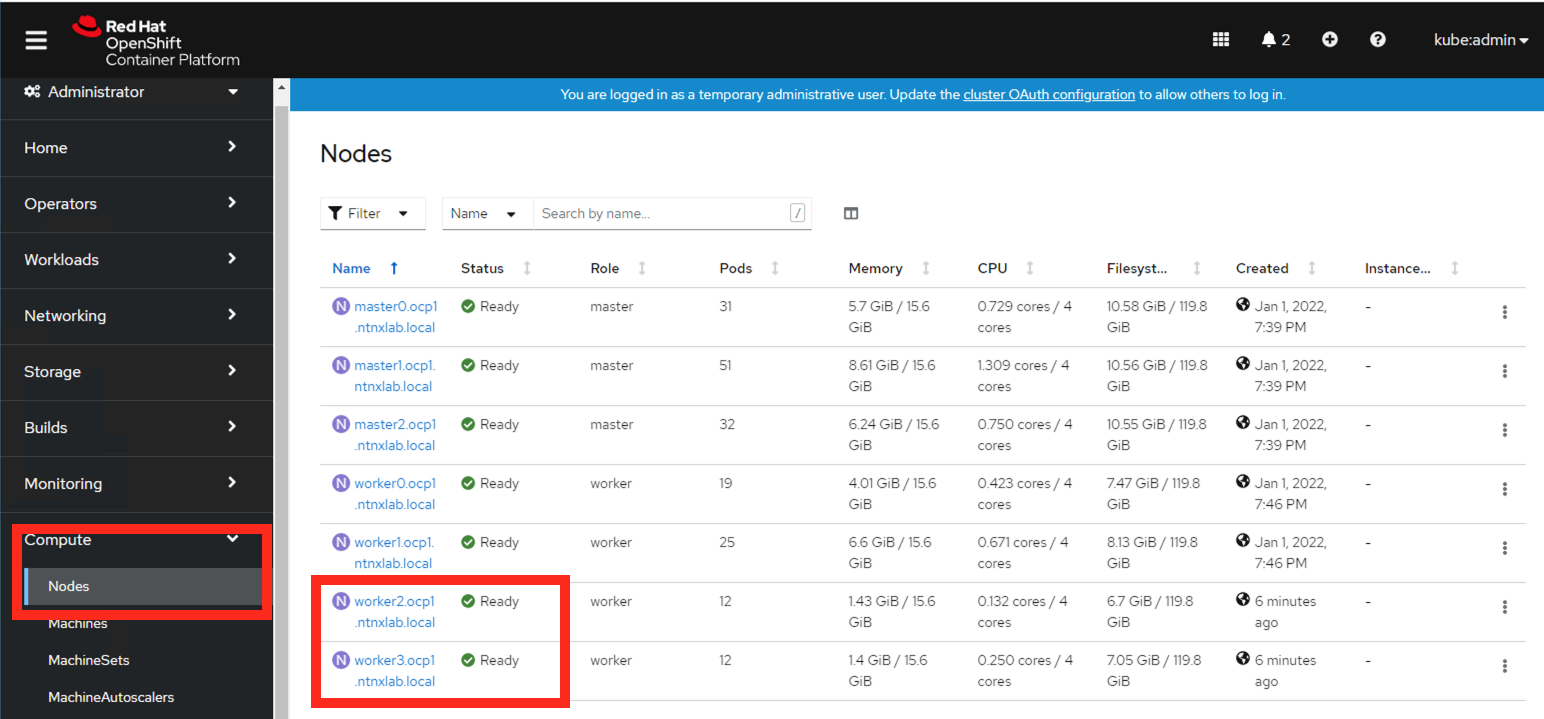 In your OCP Console, go to Compute > Nodes and make sure OCP has picked up the two extra worker nodes