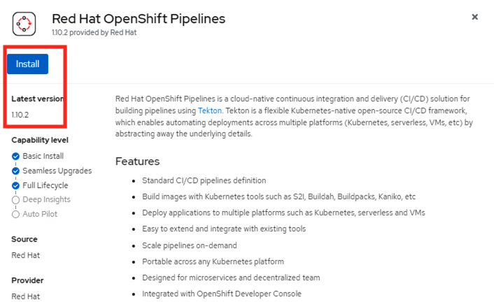 - Install Red Hat OpenShift Pipelines operator from OperatorHub
