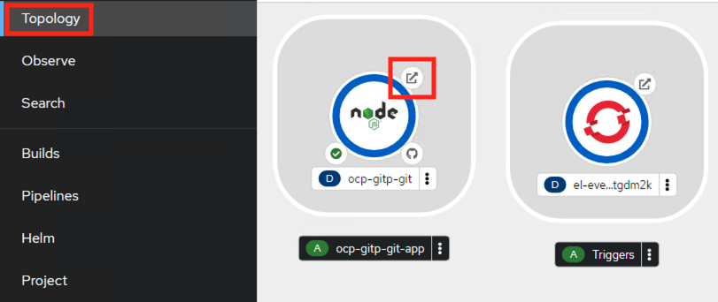 Click on Topology option, and click on the URL on your application as shown here, this is a route created by the pipeline for application access