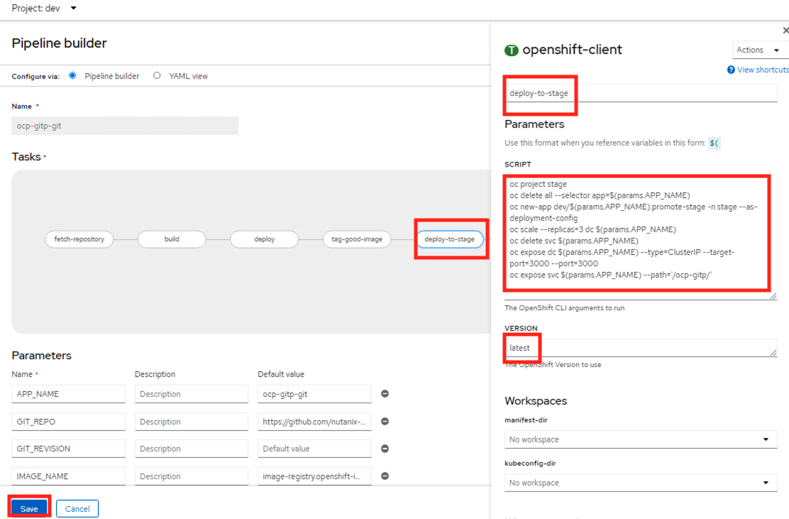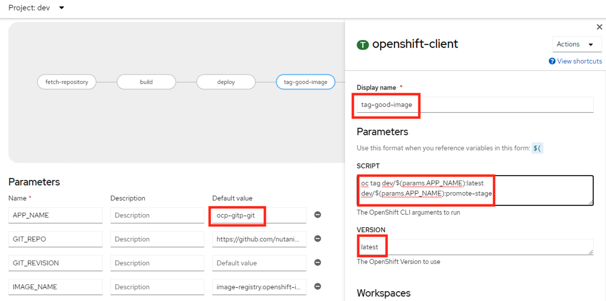 Paste this without alteringoc tag dev/$(params.APP_NAME):latest dev/$(params.APP_NAME):promote-stageVERSION - latest (we are configuring to use the latest version of
