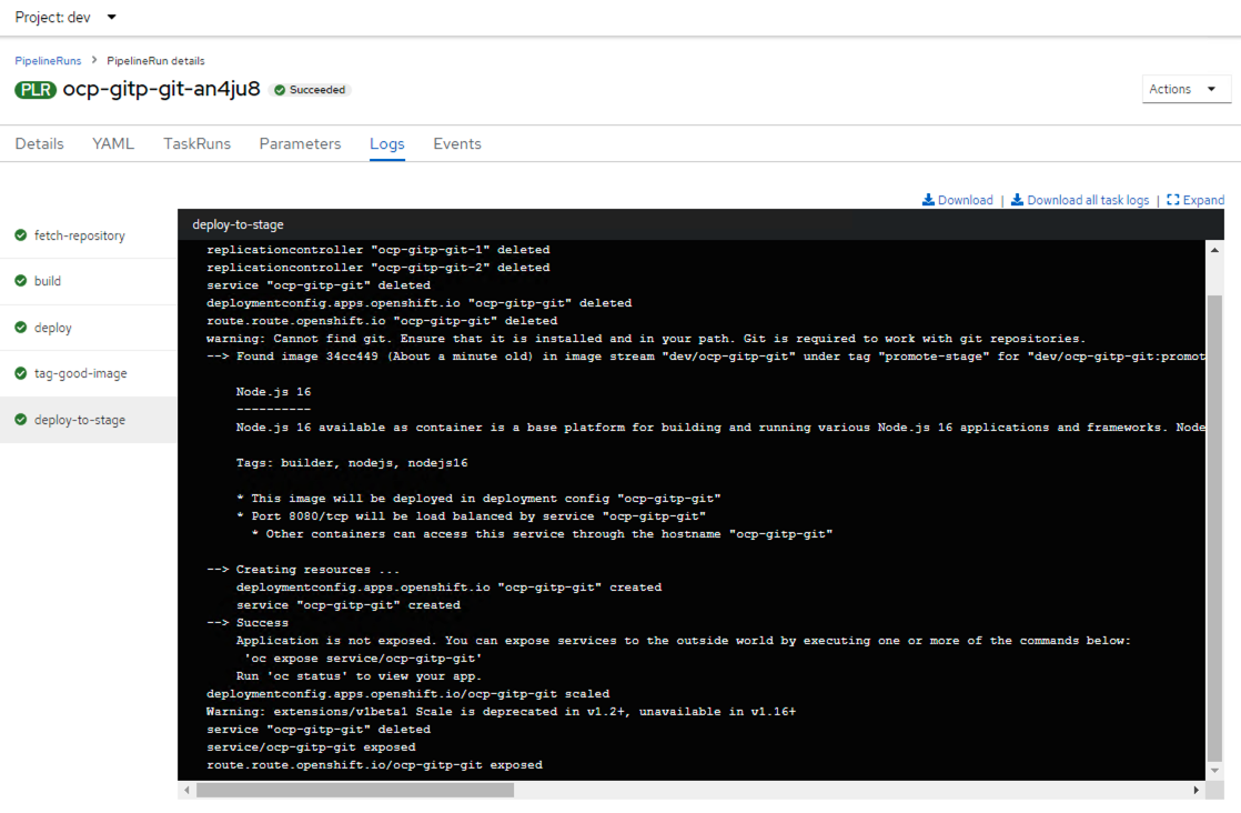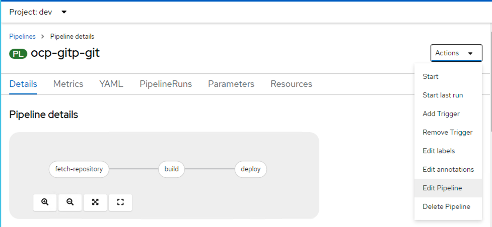 devprojectClick on Pipelines option and then click on ocp-gitp-git pipeline