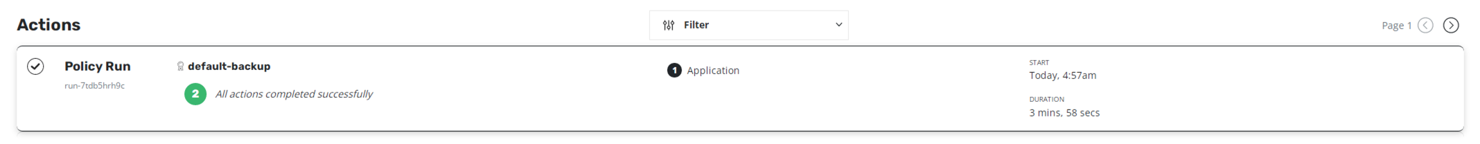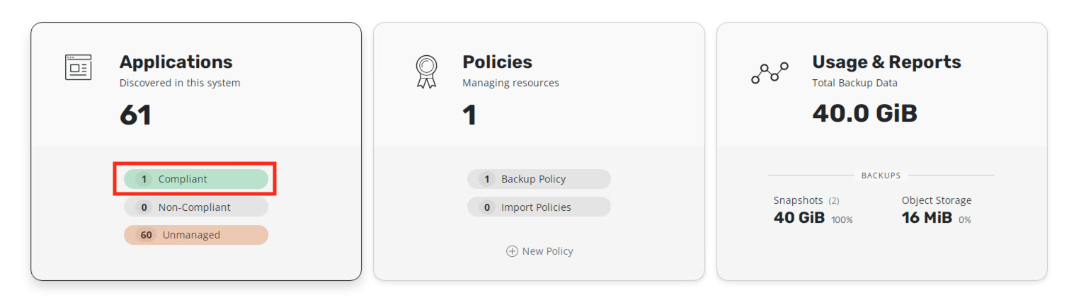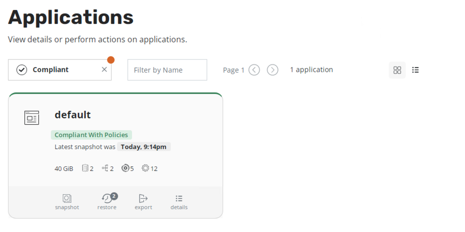 Once the backup is finished, you will see that the default namespace/application is Compliant under Dashboard > Applications